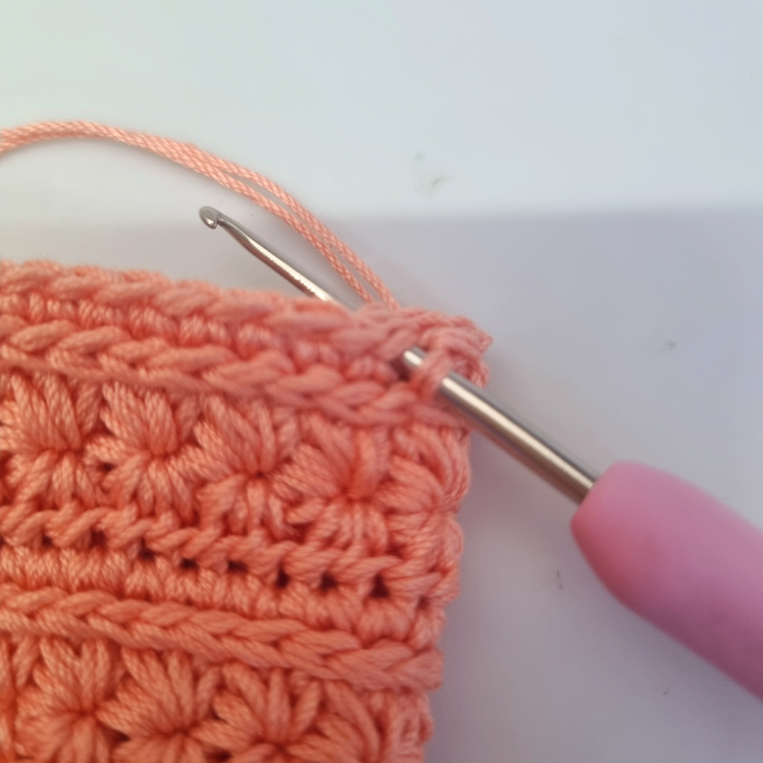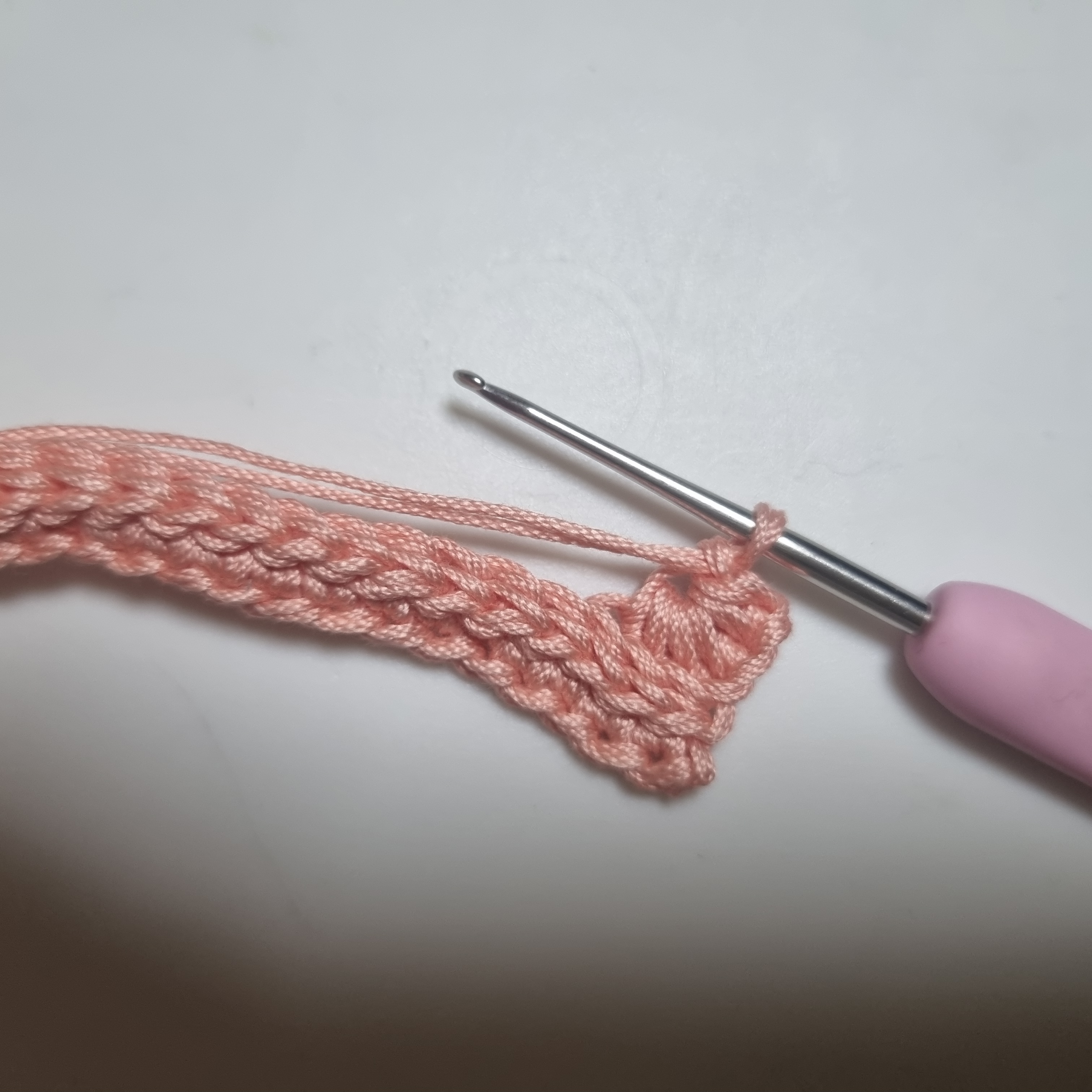 다음 단은 기둥 코 한코를 만들어 위에 사진과 같이 짧은 뜨기를 뜬 가운데에 코바늘을 넣어 빼뜨기를 해주세요
