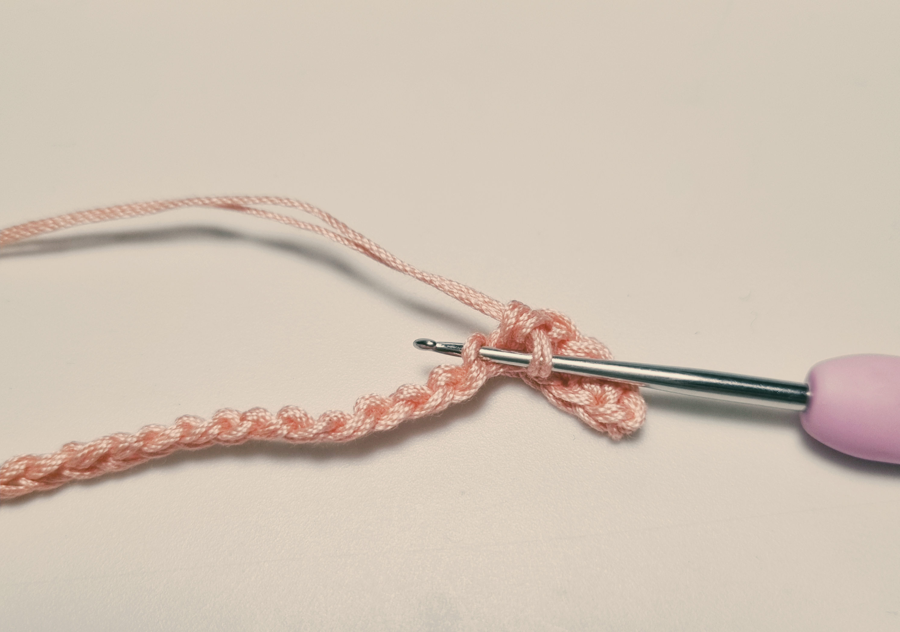 기둥코에서 위에 사진처럼 코를 3개 걸어 주세요 그리고 바로 밑에 있는 첫 코에서 코를 걸어 주세요 다음코에도 코를 걸어 주시고 또 다음 코에 코바늘에 코을 걸어 주면 코바늘에 총 6코가 걸려 있을 것입니다
