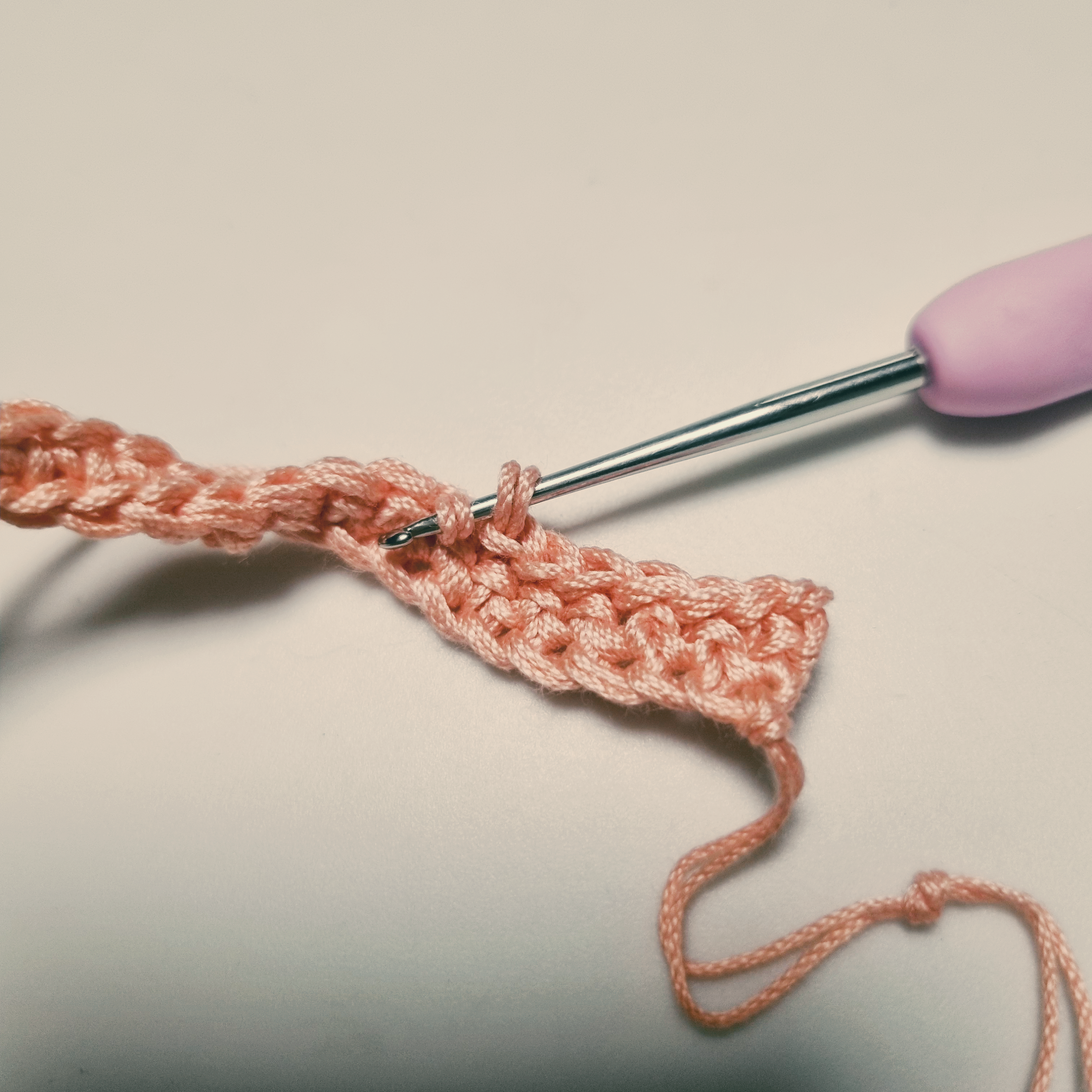 다음 단은 기둥 코 한코를 만들어 위에 사진과 같이 짧은 뜨기를 뜬 가운데에 코바늘을 넣어 빼뜨기를 해주세요