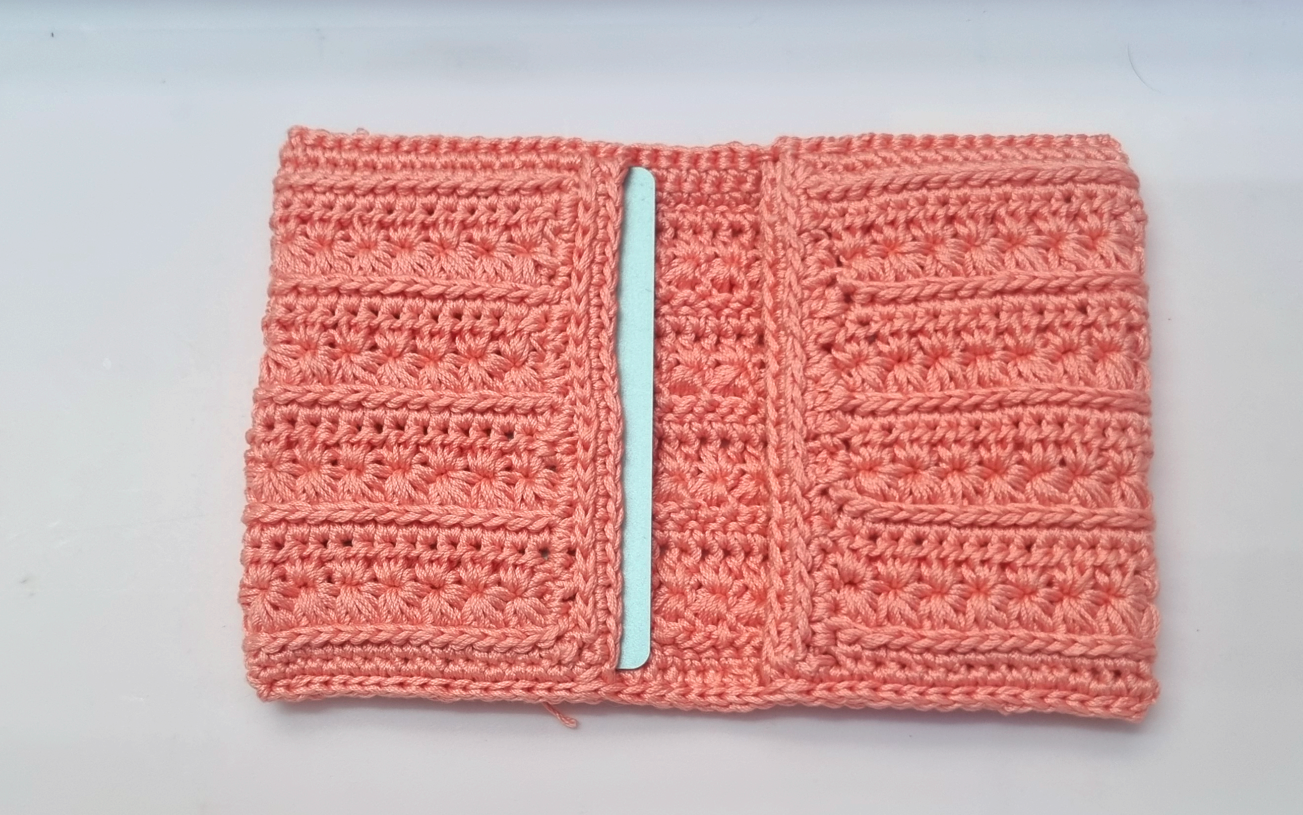 가운데 부분은 2cm~3cm 정도 남겨두고 카드가 들어갈 부분을 양쪽으로 접어서 코바늘을 이용해 연결해 주거나 바늘을 이용해 연결해 주시면 됩니다.