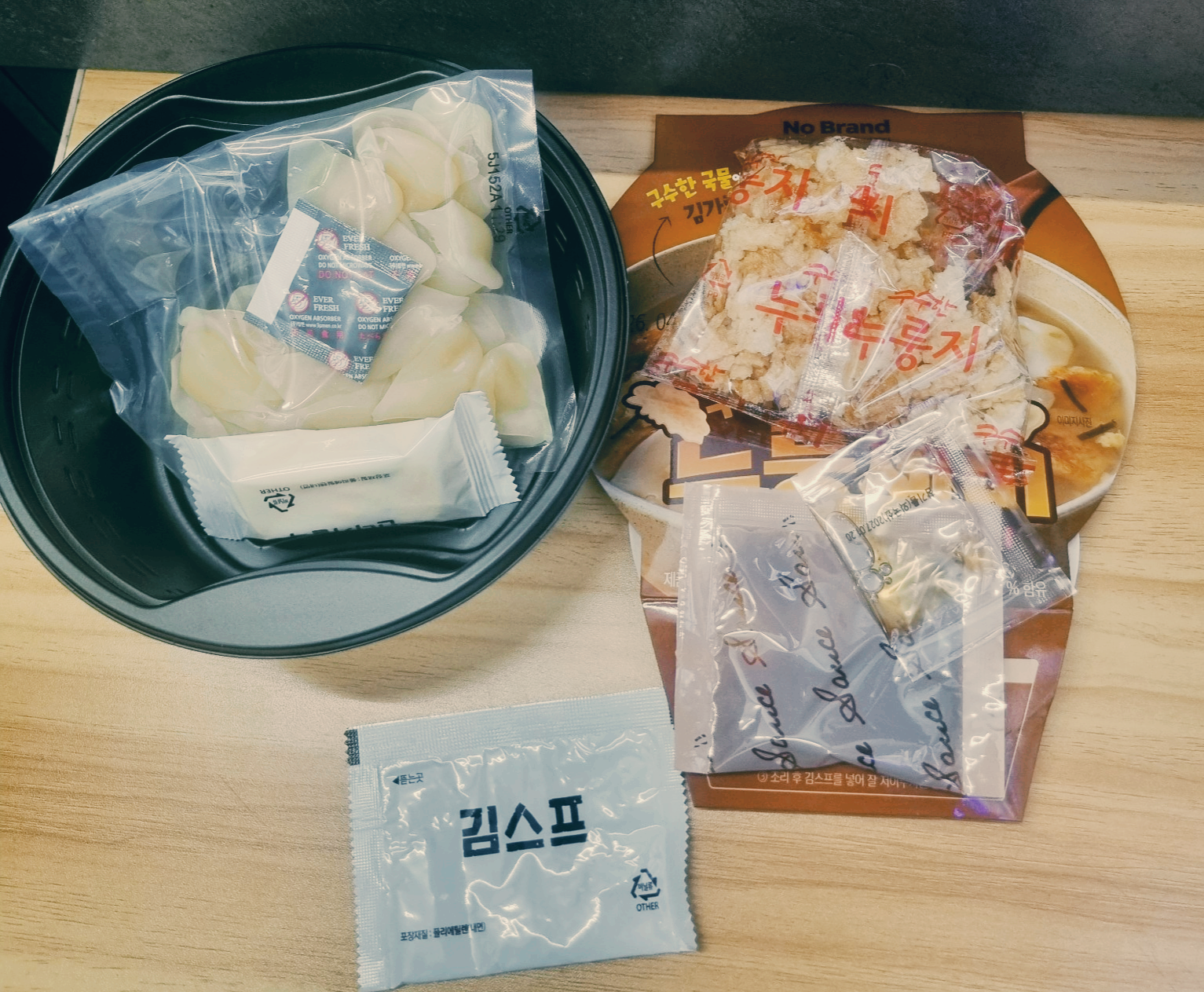 포장을 열어보면 구성은 생각보다 단정합니다. 수제비 반죽은 따로 밀봉되어 있고, 누룽지는 덩어리 형태로 들어 있으며, 육수 베이스와 참기름, 김스프도 각각 분리되어 있습니다.