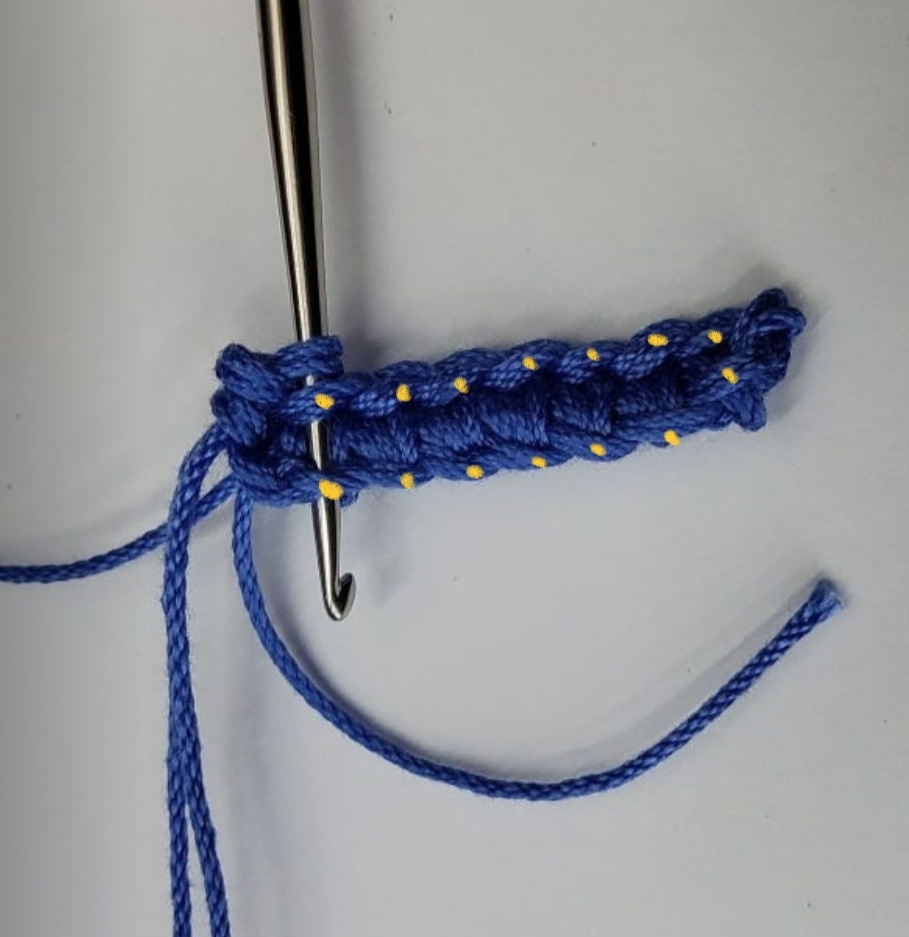 제가 노란 점으로 위아래 찍어났는데 위 아래 짝을 맞혀서 두줄을 코바늘에 한꺼번에 넣어서 실을 걸어 빼주시고 짧은 뜨기를 쭉해주면 됩니다.
