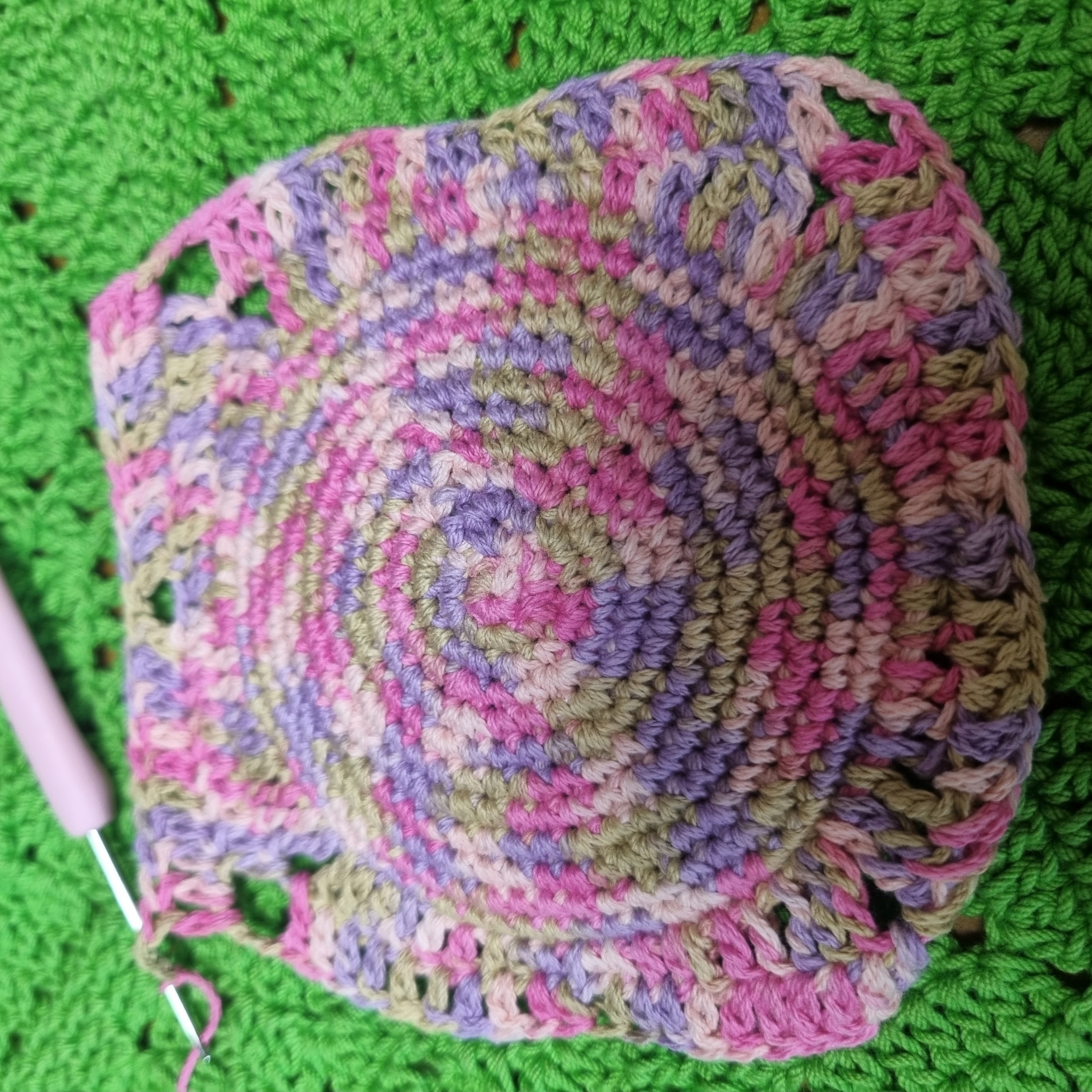 - 모서리 4곳마다: 긴뜨기 2개, 사슬 2개, 긴뜨기 2개 삽입 → 사각 형태 유도