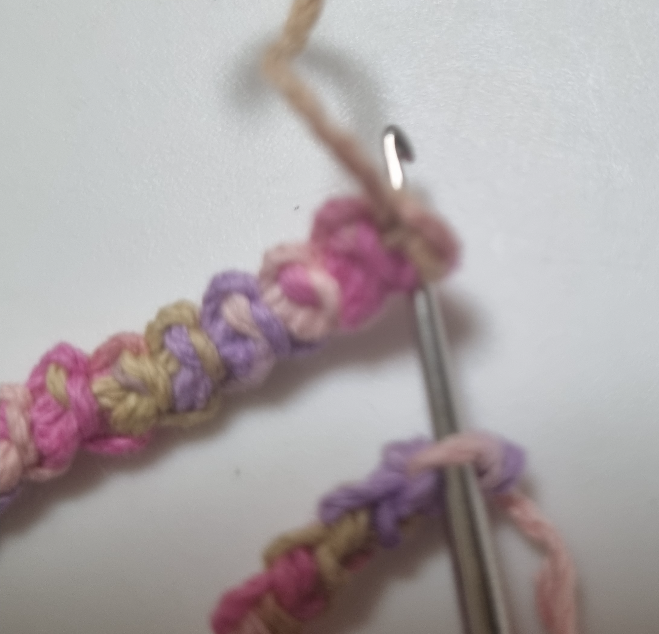 새우 뜨기로 만든 끈 두 개를 사진처럼 코바늘로 코와 코를 넣어 실은 밑에서 한꺼번에 빼주시면 됩니다
