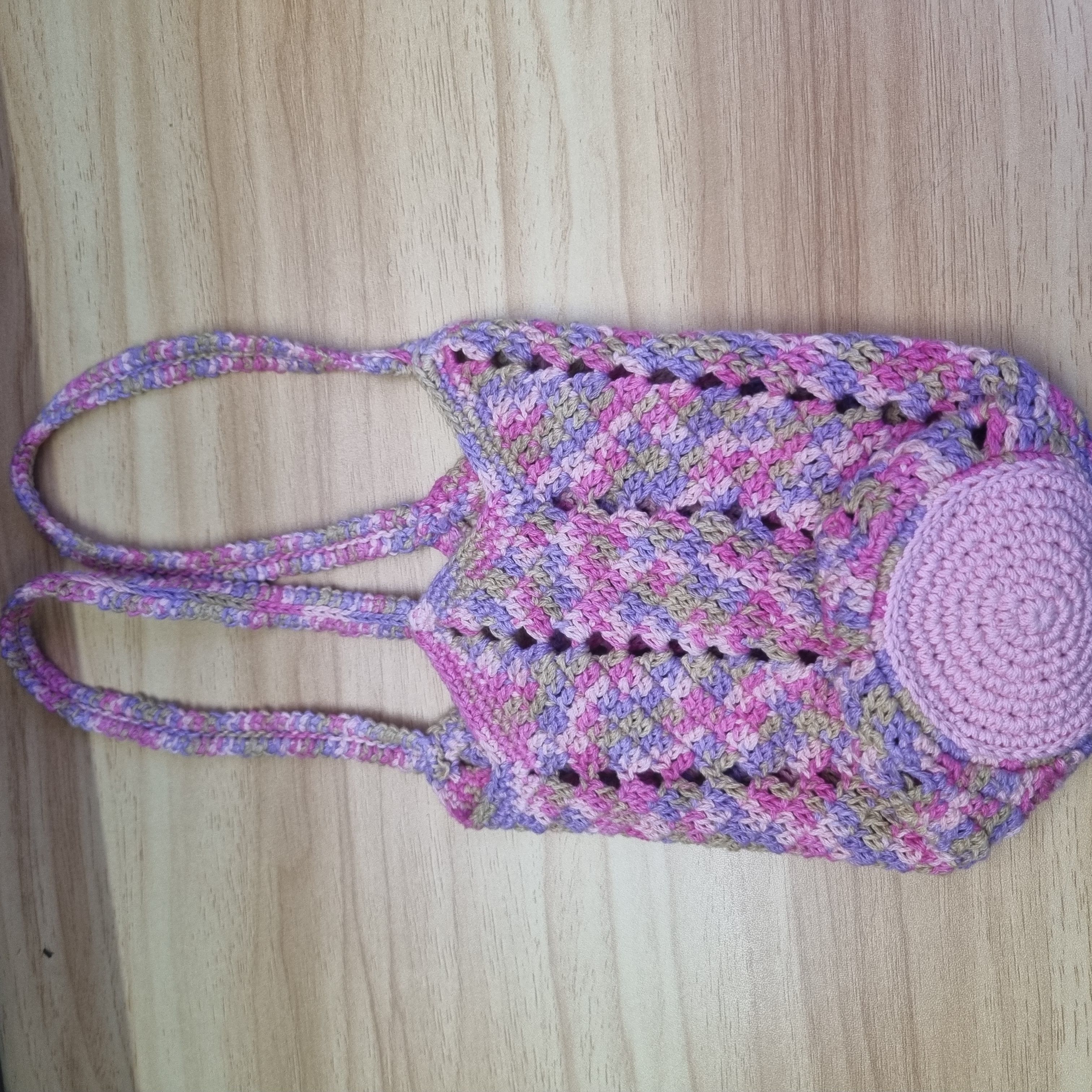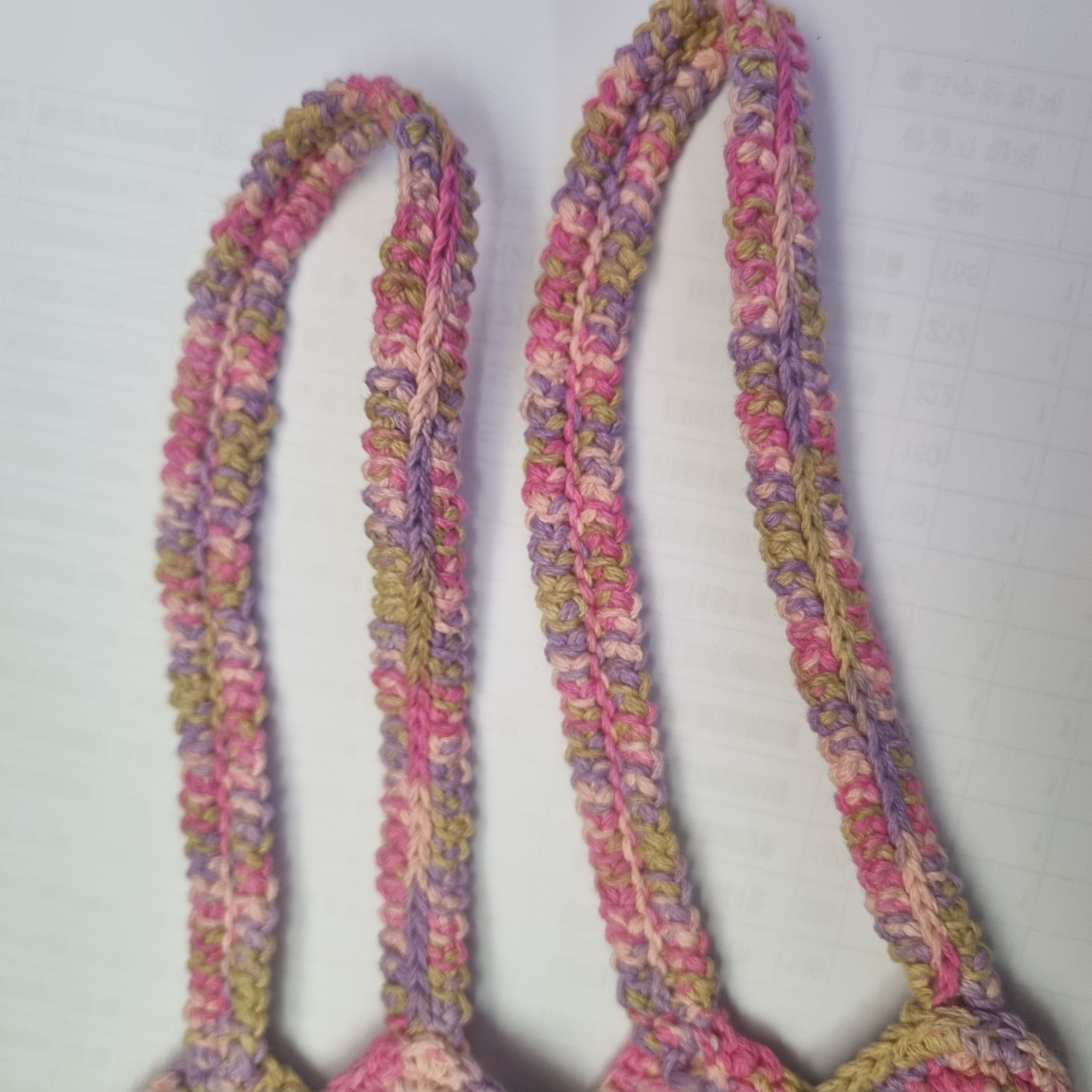처음에는 몸통까지 같은 실로 이어갔지만, 나중에 안정감을 더해주기 위해 단색 연핑크 실로 바닥을 다시 덧대어 마감해줬어요. 단단한 짧은 뜨기로 조밀하게 뜬 다음, 몸통과 깔끔하게 연결했습니다.