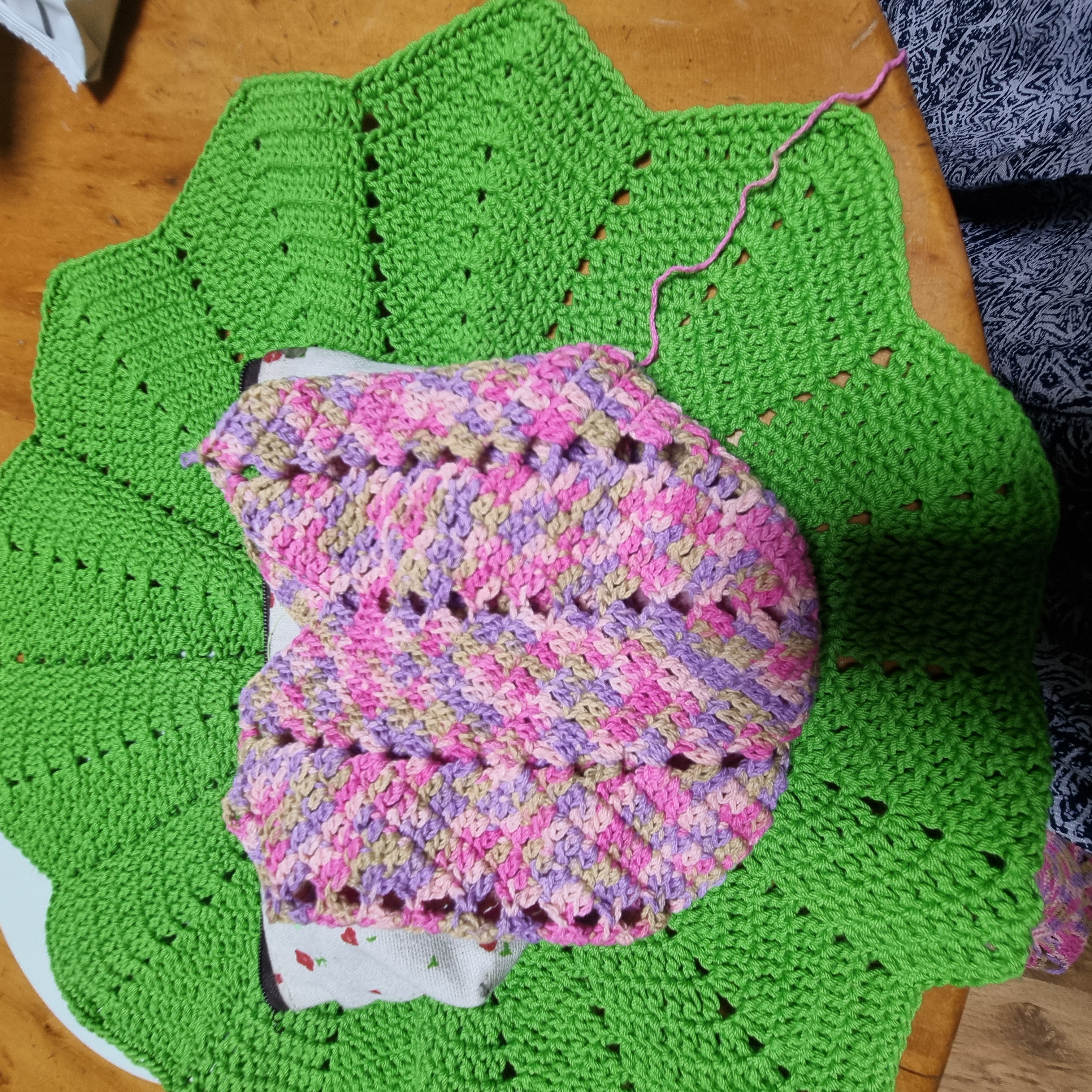 원형으로 뜬거 2장을 서로 붙어서 짧은 뜨기를 해주었습니다 원래 다른 곳에서는 바닥을 사각모양으로 해주는데 저는 바닥을 좀 원형으로 하는 바람에 네 등분을 나누어주어야 했습니다